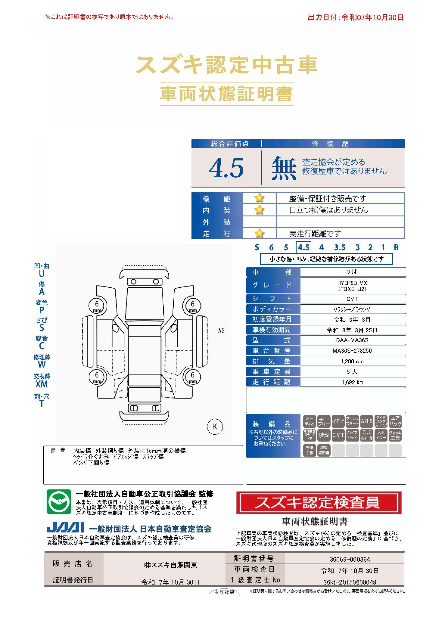 車両保証(ソリオ ハイブリッドMX:(株)スズキ自販関東 スズキアリーナ大宮中央)