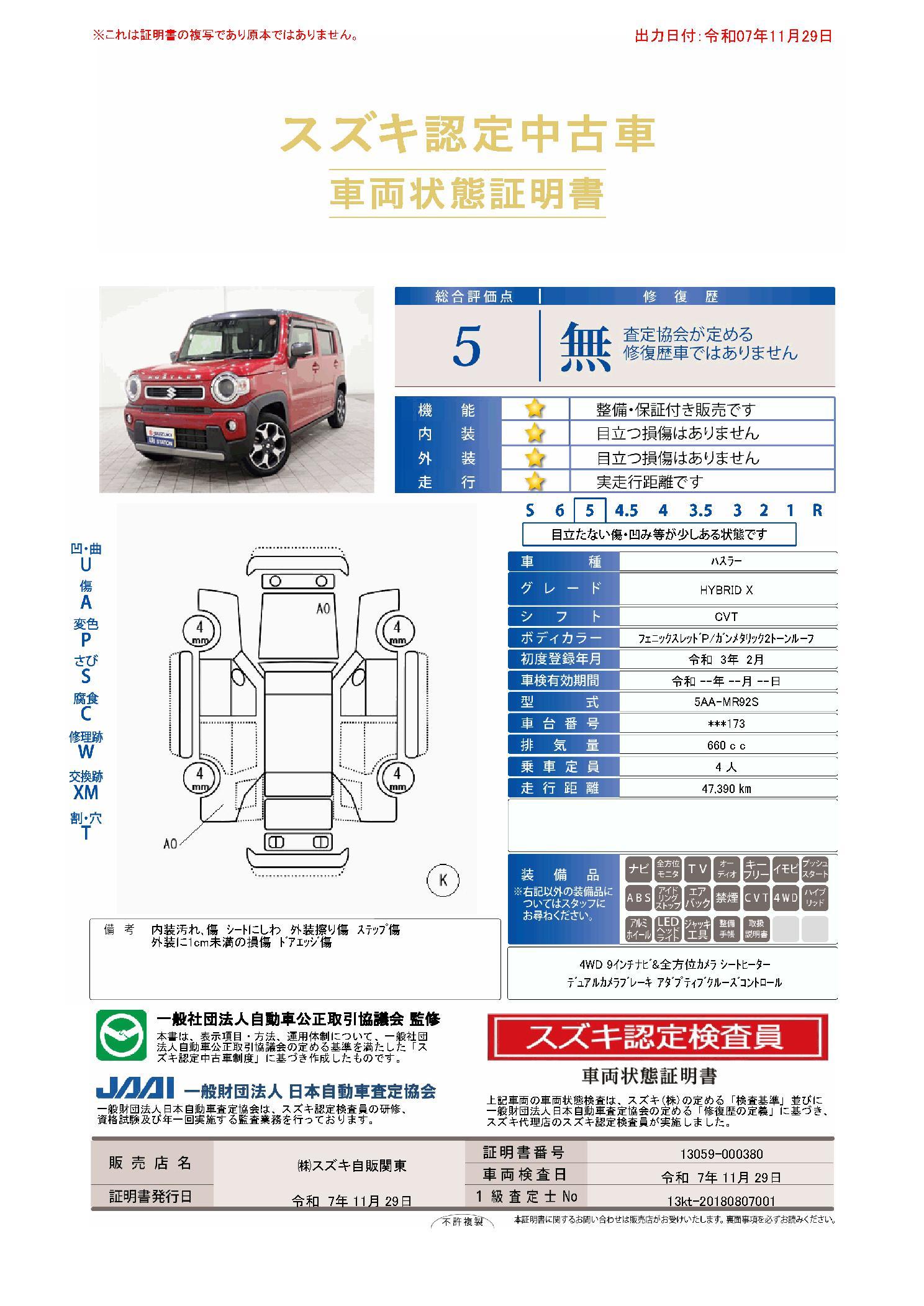 車両保証(ハスラー ハイブリッドX:(株)スズキ自販関東 スズキアリーナ仙台中央)