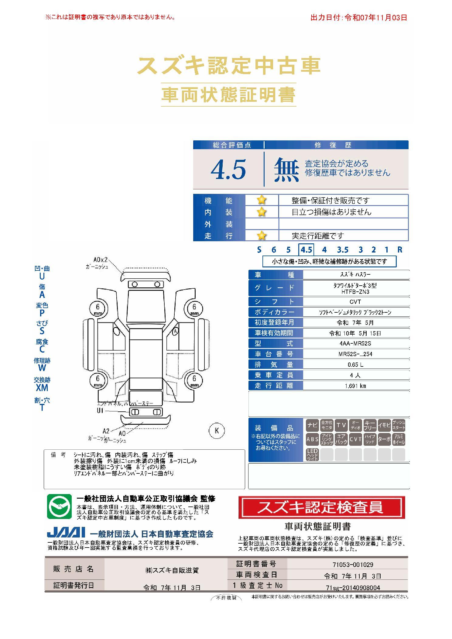 | 車両状態評価書 | ※クリックすると開きます![]() |
