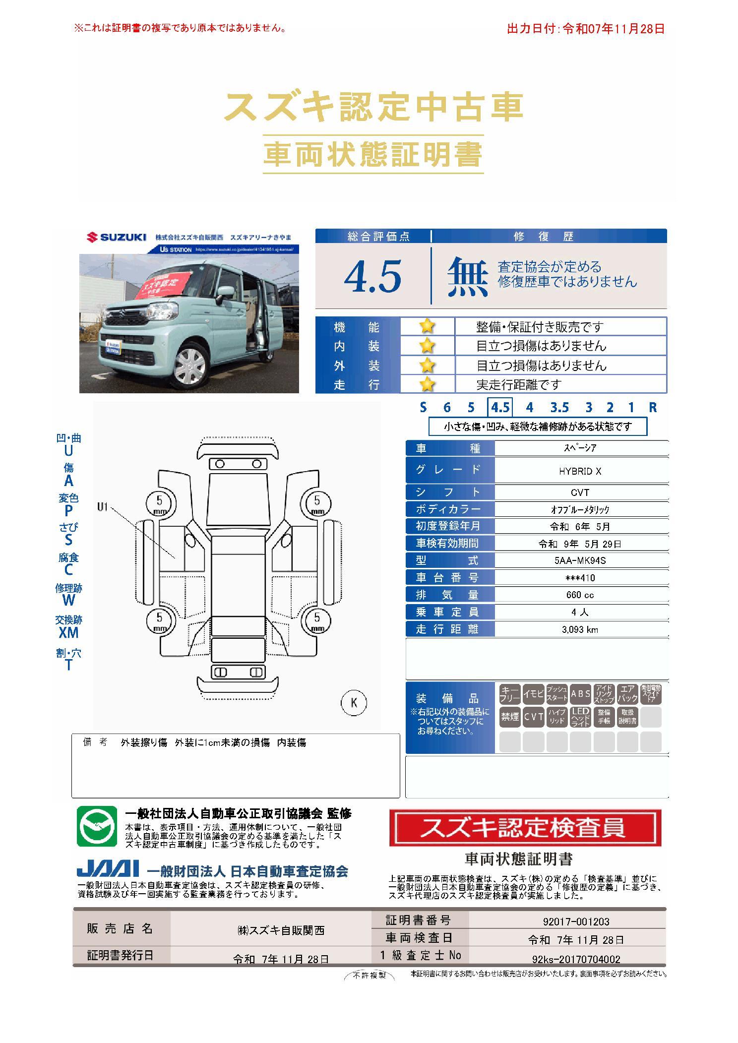 車両保証(スペーシア ハイブリッドX:(株)スズキ自販関西 スズキアリーナきやま)