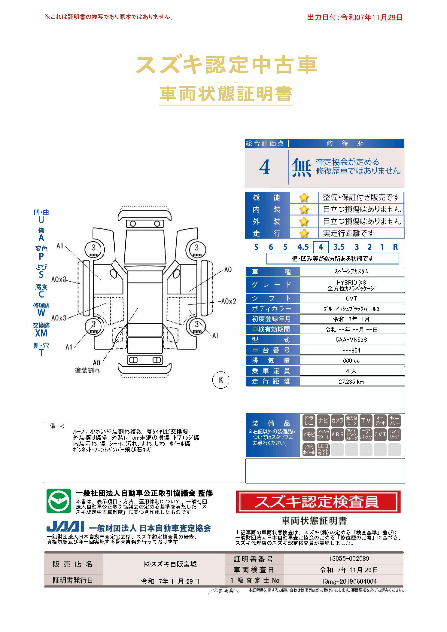 | 車両状態評価書 | ※クリックすると開きます![]() |