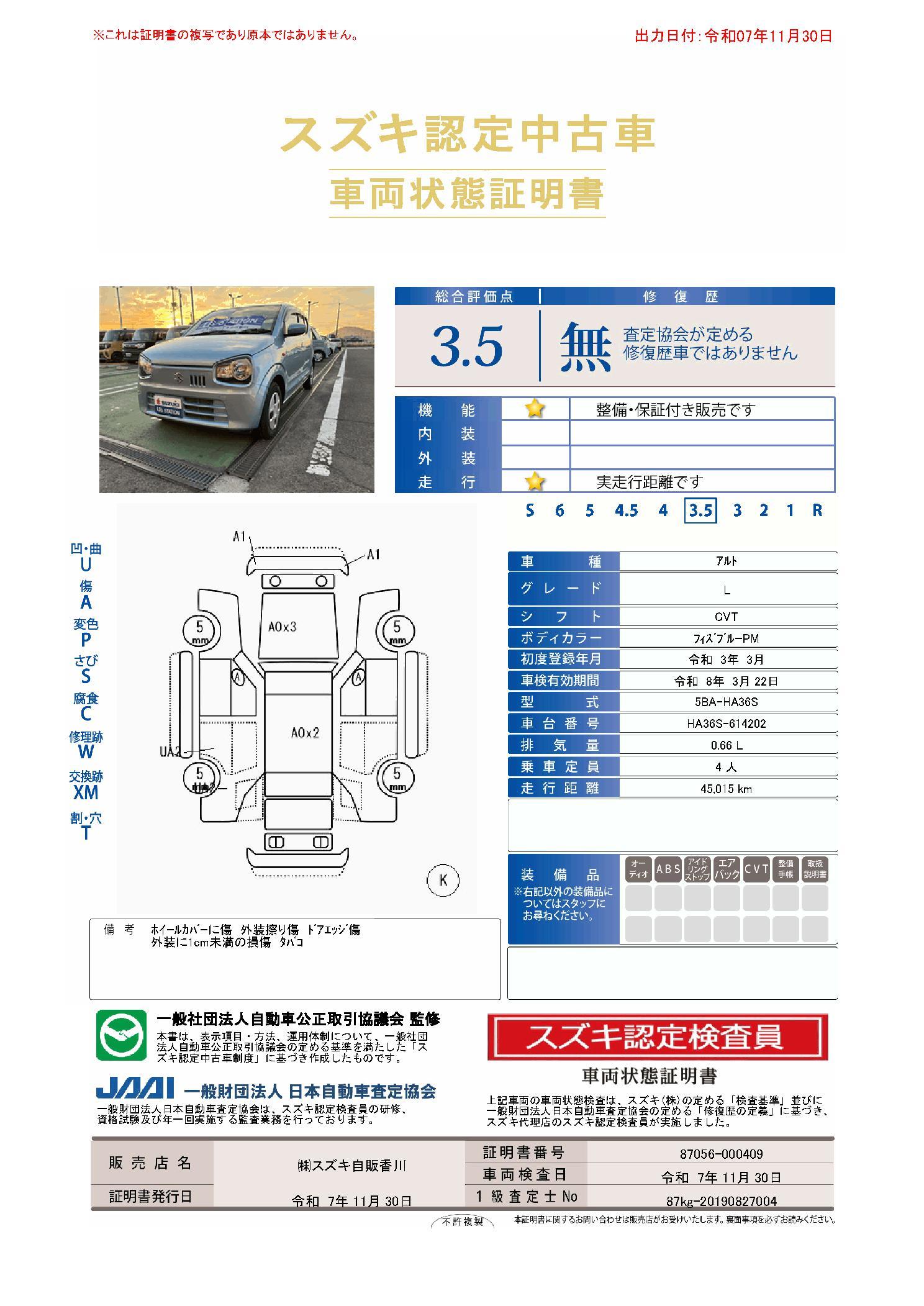 車両保証(アルト L:(株)スズキ自販香川 高松東営業所 / U’s STATION高松東)