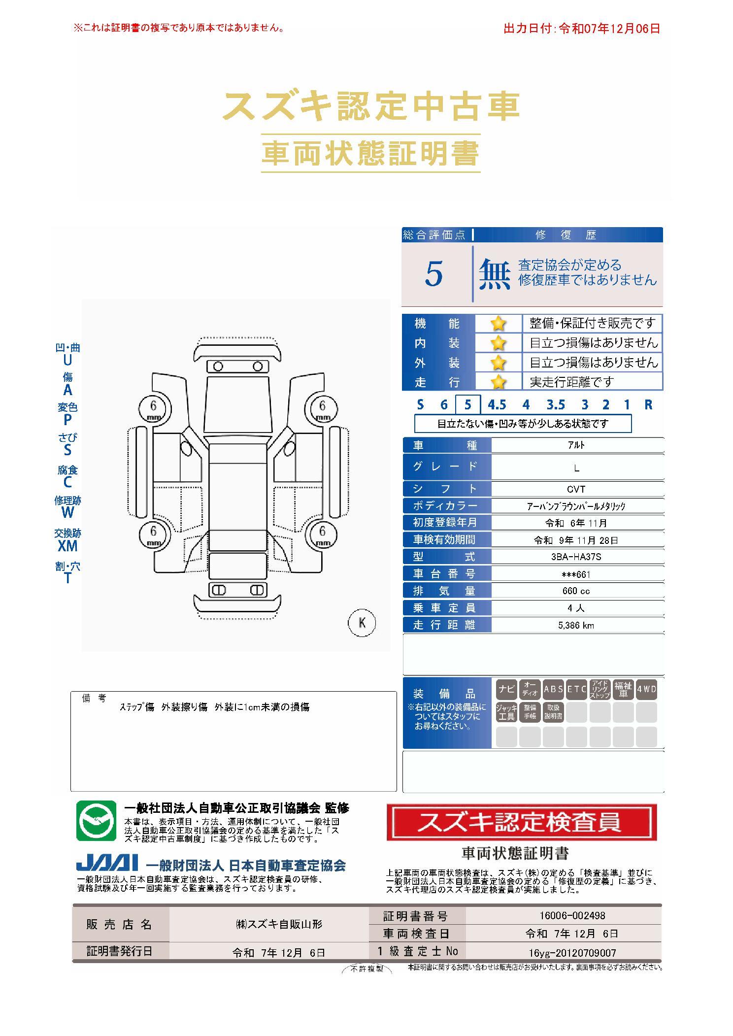 車両保証(アルト L:(株)スズキ自販山形 スズキアリーナ鶴岡宝田/U’s STATION鶴岡)