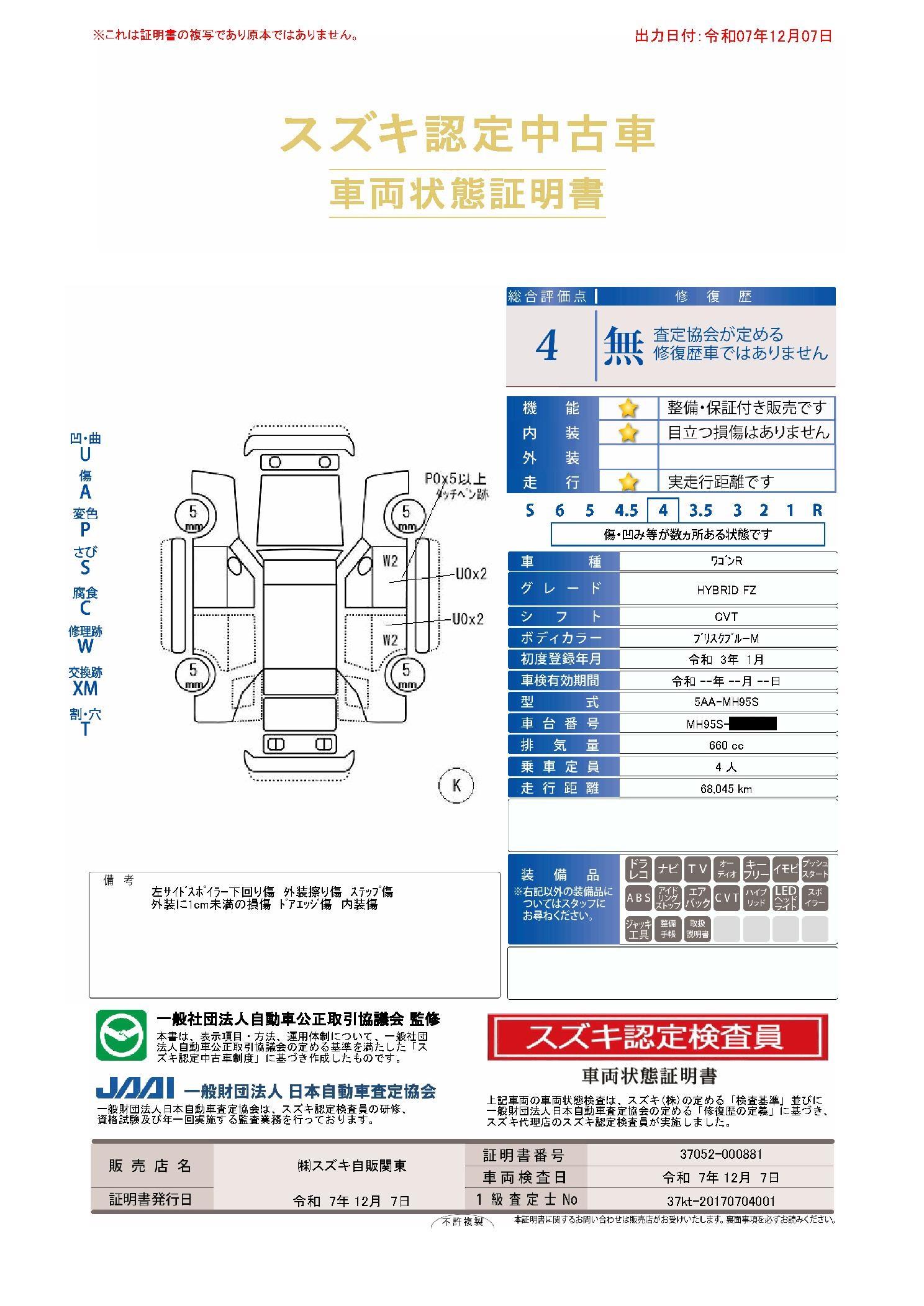 車両保証(ワゴンR ハイブリッドFZ:(株)スズキ自販関東 成田営業所)