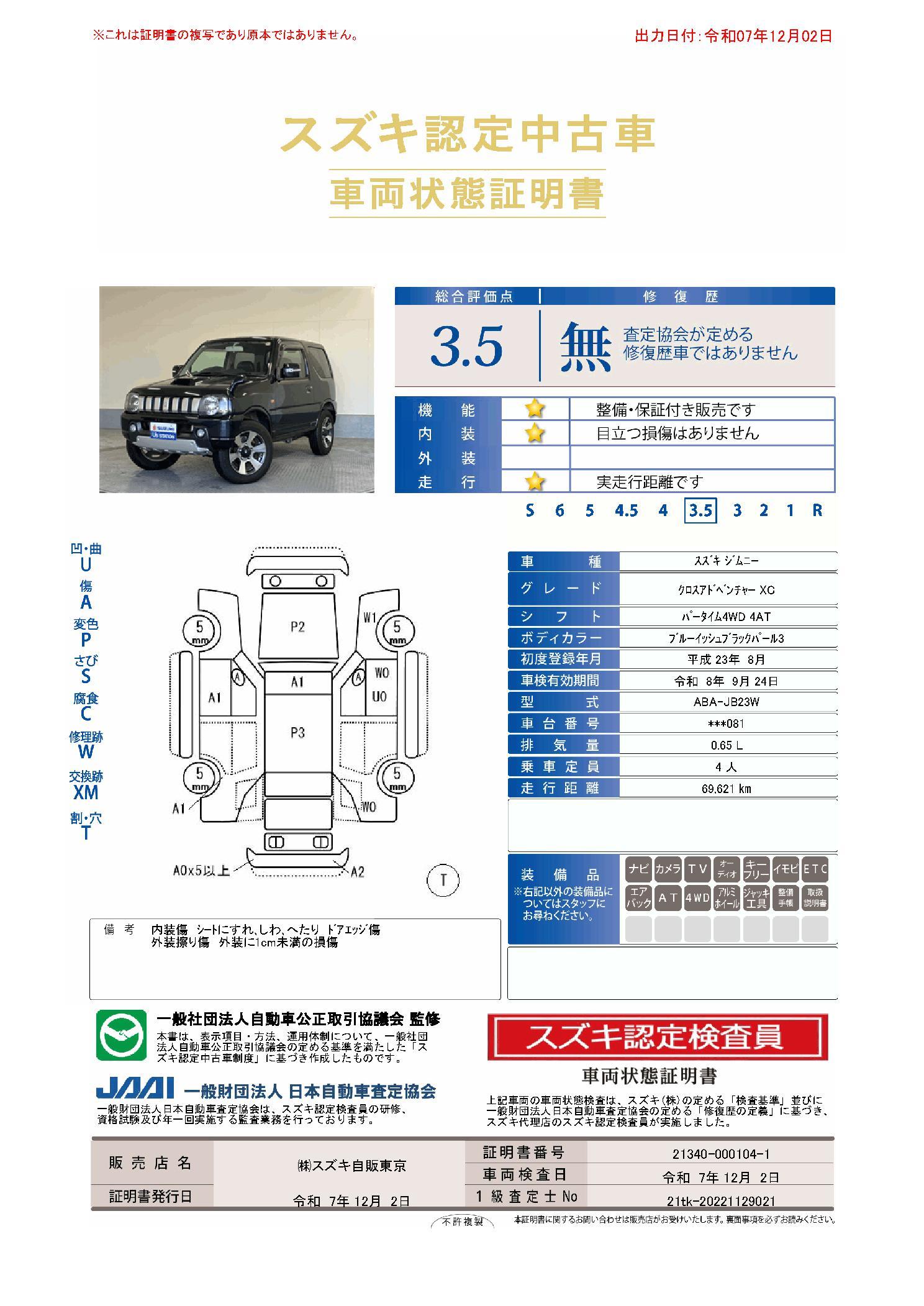 | 車両状態評価書 | ※クリックすると開きます![]() |