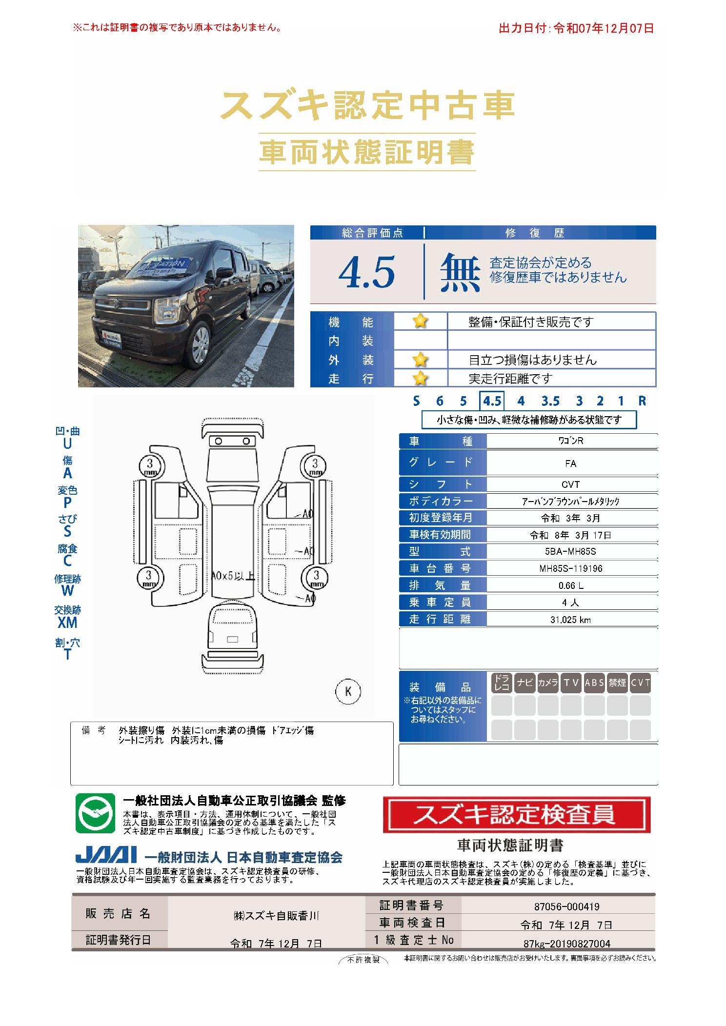 車両保証(ワゴンR FA:(株)スズキ自販香川 高松東営業所 / U’s STATION高松東)