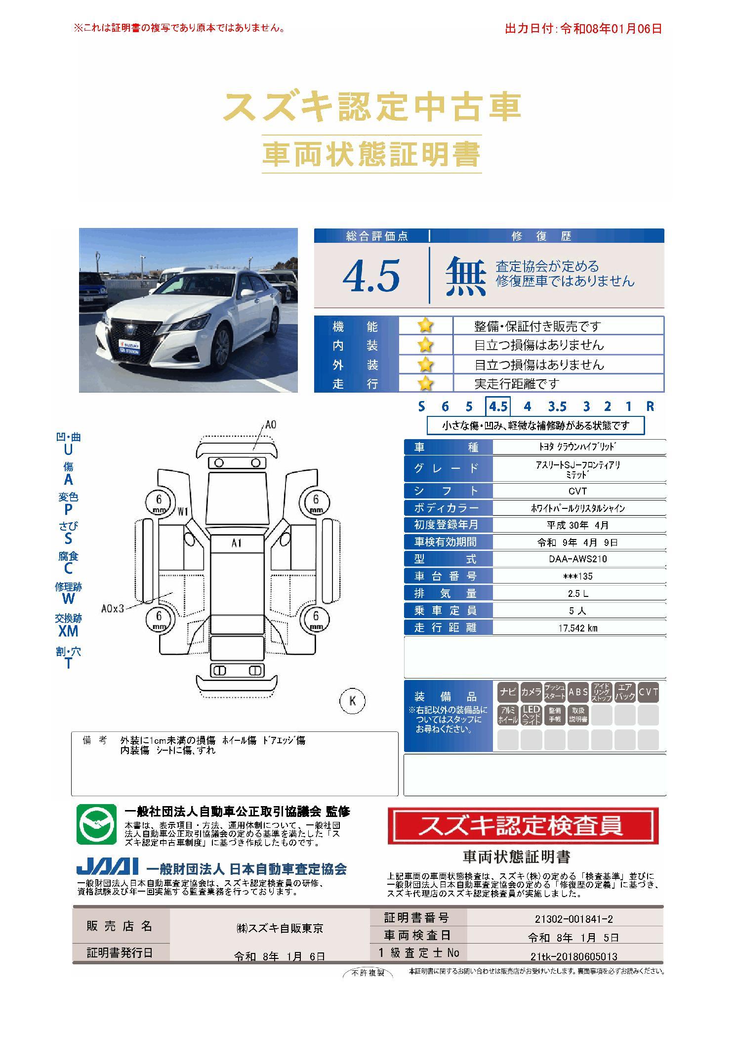 車両保証(クラウンハイブリッド アスリートS J-フロンティアリミテッド:(株)スズキ自販東京 スズキアリーナ世田谷)