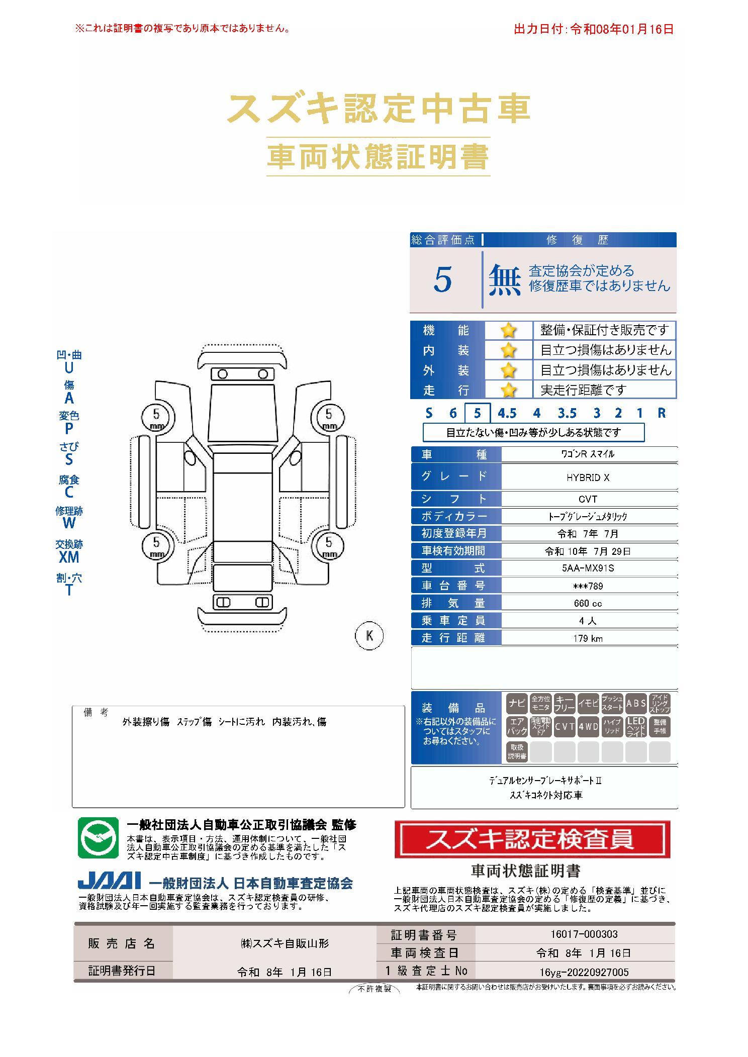| 走行距離 | 179km | 修復歴 | 無 |