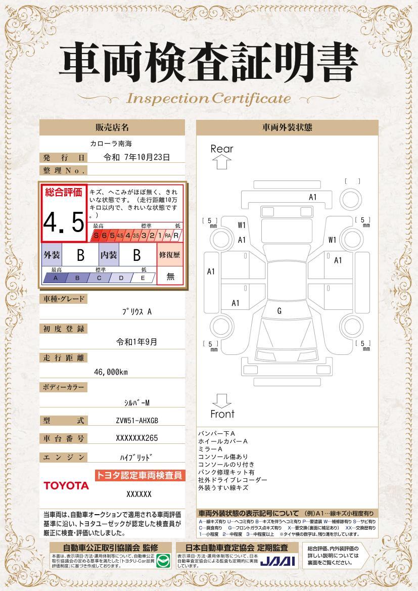 | 保証内容 | ロングラン保証1年<走行距離無制限> +ハイブリッド保証<保証期間は初度登録年月から10年目まで、もしくは3年間のいずれか長い方。但し走行距離20万キロまで> | ||