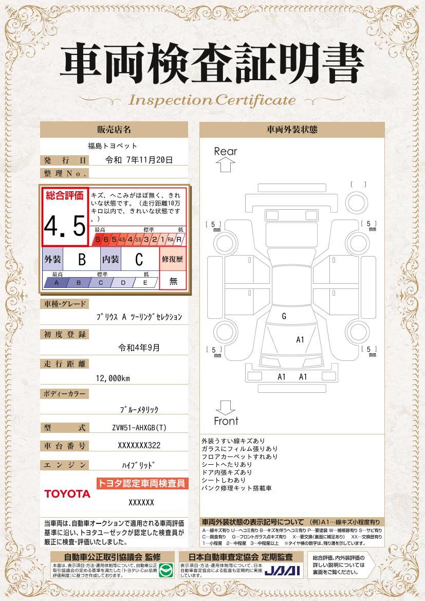 車両保証(プリウス Aツーリングセレクション:福島トヨペット(株) オンリーユー)