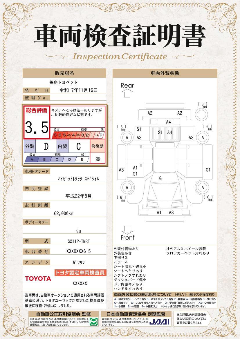 車両保証(ハイゼットトラック スペシャル:福島トヨペット(株) オンリーユー)